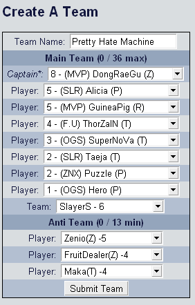 Először is, szükségetek lesz egy TeamLiquid accountra. Amennyiben még nincs, itt regisztrálhattok egyet – igazán nem bonyolult. Ezután ellátogattok ide, ahol megnézhetitek, hogy melyik játékos/csapat hány pontba kerül. Ne feledjétek, 36 pontotok van az Elsődleges, és 13 pontotok az Anti-csapatra. Ha sikerült fejben megalkotnotok a saját kis fantáziacsapatotokat, akkor ideje feliratkozni! Itt nem érhet titeket meglepetés, hiszen már mindenről tudtok. Az egyetlen dolog, amiről még nem esett szó, az a csapatnév. De ez csak természetes, hogy a saját csapatotoknak adnotok kell valami egyedi nevet. Csak hogy méginkább a szívetekhez nőjjön, tudjátok.:)