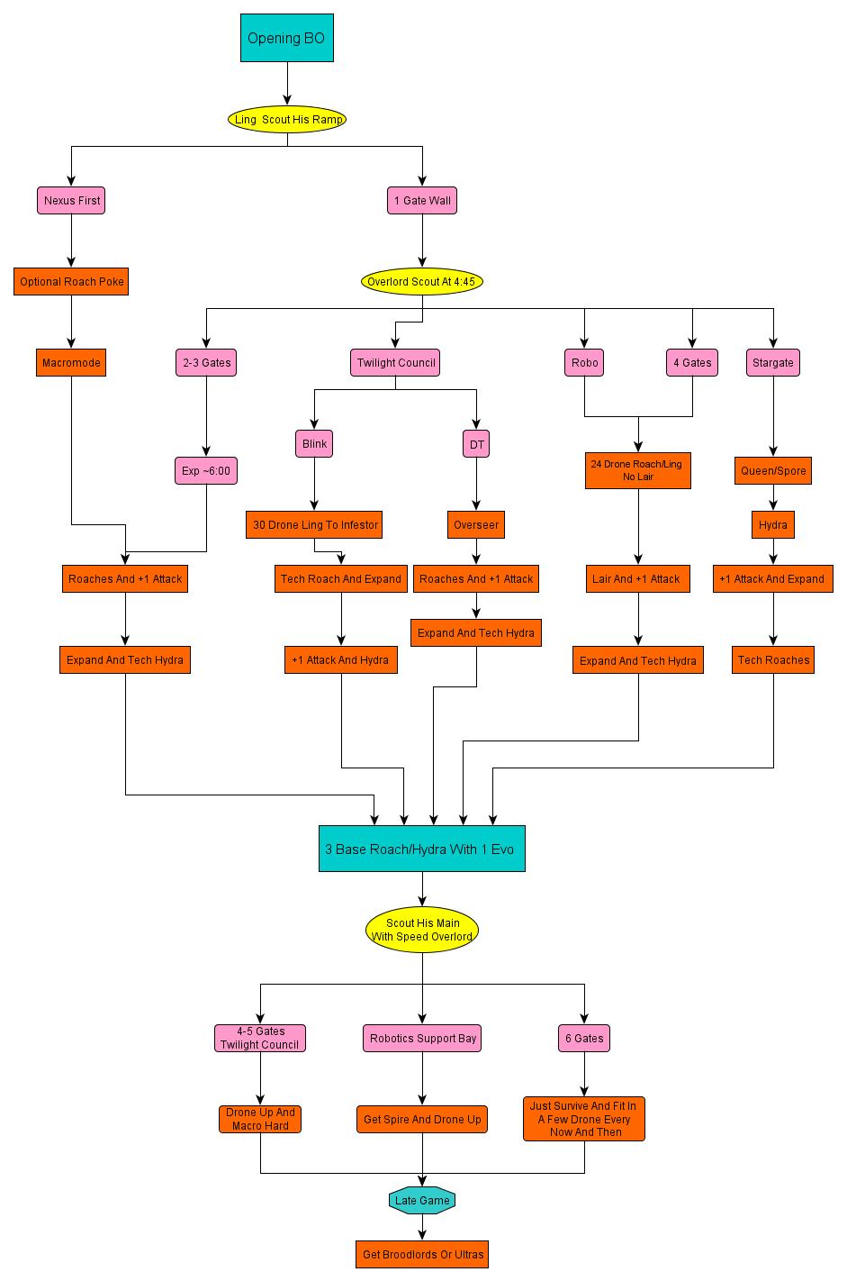 Mikor kész a Lair fejleszd ki a Roach sebességet amint lehet, és mehet a harmadik, negyedik gáz. Ha úgy látod hogy csak gateway serege van, fejleszd ki hogy az egységeid tudjanak föld alá menni, ha nem tudod vagy nem hiszed hogy csak Gateway egységek vannak, akkor Overlord Speed, és felderítés a gyors Overlordokkal.