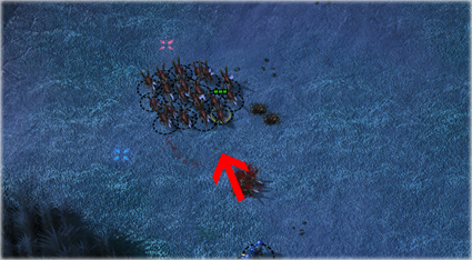 A lenti kép egy egyszerű, de jó szemléltető példa arra, hogy minél nagyobb pusztítást végezzenek a banelingek, mert ha az egységek egyszerűen csak a bázisunkhoz vannak küldve a Scrap Stationon, a legrövidebb út miatt biztosan átmennek a banelingek felett. Abban az esetben kerüli ki az ellenség ezeket a banelingeket, ha az aranybázisra szeretne támadni, vagy ha a szigeten lévőre. De ilyenkor már a közelben van creep, és ebből gondolhatja, hogy van ott bázis. Ha van creep, a Terran lehet, hogy scannelni fog, hogy eltüntesse, ekkor biztos, hogy lebuknak a Banelingek. Mindig gondoljuk át a baneling elhelyezését, képzeljük, el mi merre mennénk, és mit csinálnánk az ő helyébe.