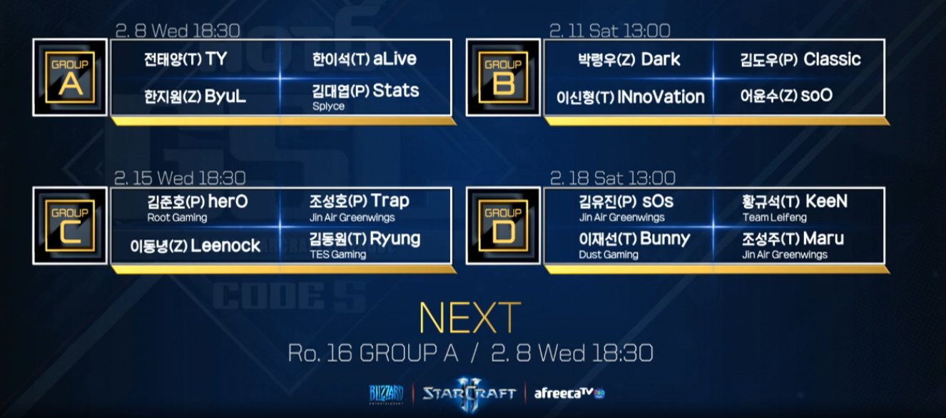 Február 1-én került sor a GSL Code S 1. szezonjának csoportválasztójára, ami a fenti képen látható csoportokat eredményezte. A GSL hagyományaihoz híven a csoportokat a játékosok állították össze, erről felvétel is készült, amit a verseny YouTube csatornáján tudtok visszanézni. Ha lemaradtatok volna az első csoportkör mérkőzéseiről, akkor itt ezt is bepótolhatjátok. A bajnokság február 8-án szerdán folytatódik 10:30-tól.
